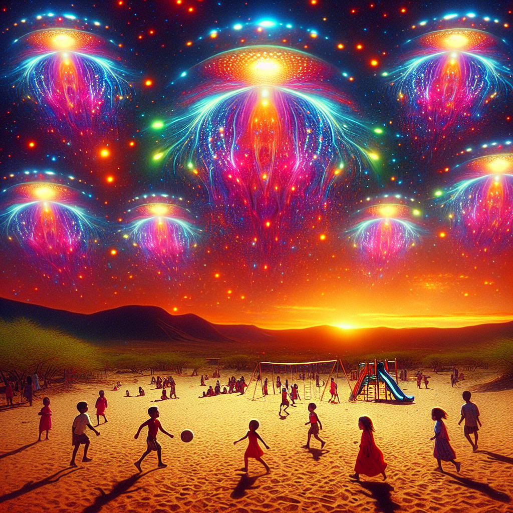 Prompt: Create an image of a cluster of ethereal lights floating in the night sky over a desert landscape. The lights twinkle in mesmerizing patterns, resembling UFO sightings over a vast, arid expanse. Below, a desert playground is bustling with children engaged in joyous play. The setting is transformed by a surreal fusion of sky and land, capturing the juxtaposition of otherworldly phenomena and everyday childhood activity. There's a subtle nod to the popularity of the name "Kennedy" in the state through the presence of multiple children bearing the name, adding a touch of whimsy and local character to the scene. The depiction should include only scenes, people, and objects, it should not include text or speech bubbles.