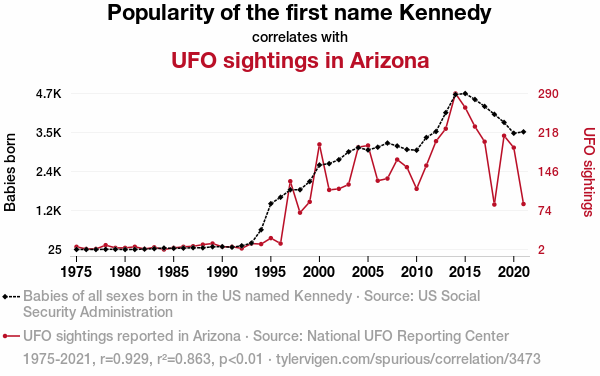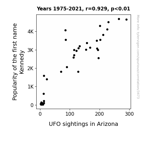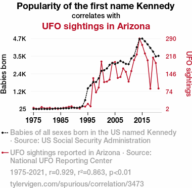 This means 86.3% of the change in the one variable (i.e., UFO sightings in Arizona) is predictable based on the change in the other (i.e., Popularity of the first name Kennedy) over the 47 years from 1975 through 2021.