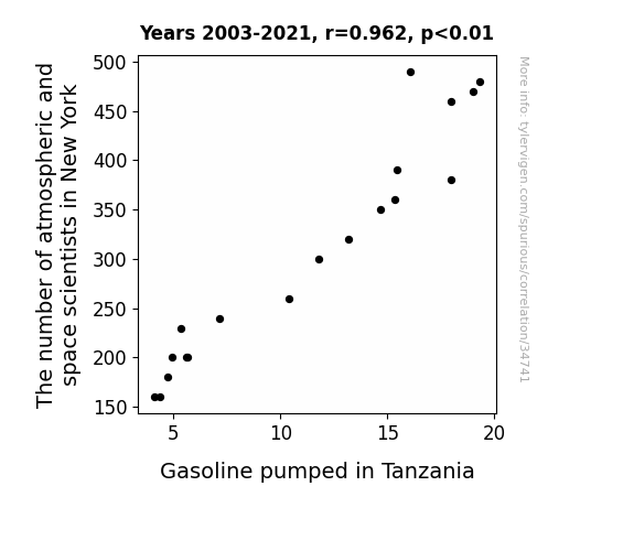 This means 92.6% of the change in the one variable (i.e., Gasoline pumped in Tanzania) is predictable based on the change in the other (i.e., The number of atmospheric and space scientists in New York) over the 19 years from 2003 through 2021.