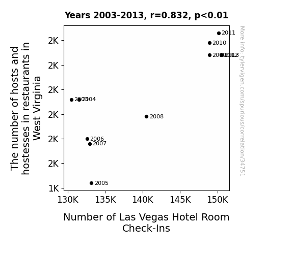 This means 69.1% of the change in the one variable (i.e., Number of Las Vegas Hotel Room Check-Ins) is predictable based on the change in the other (i.e., The number of hosts and hostesses in restaurants in West Virginia) over the 11 years from 2003 through 2013.