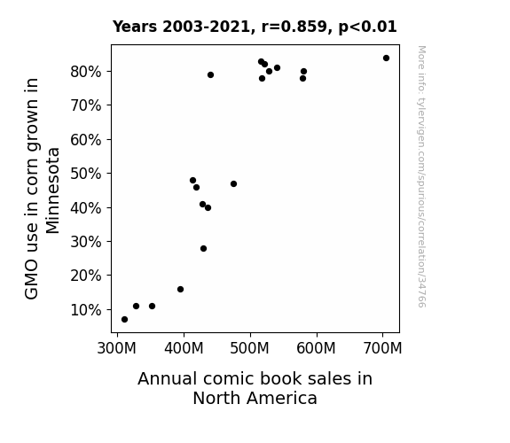 This means 73.9% of the change in the one variable (i.e., Annual comic book sales in North America) is predictable based on the change in the other (i.e., GMO use in corn grown in Minnesota) over the 19 years from 2003 through 2021.