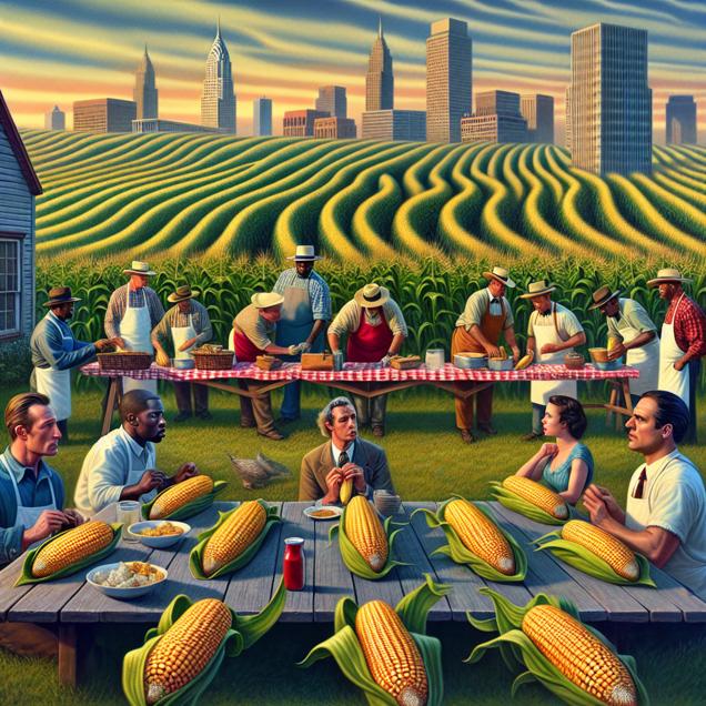 User prompt: Please respond with an image generation prompt that would be likely to create an interesting visual using DALLE-3, using the following style: [ Scalar art ] and depicting this scene: In a Texas town, a field of corn sways in the breeze, with some ears larger and genetically modified, and others smaller and natural. Nearby, a group of postmasters gather for a barbecue, struggling to hold their corn on the cob without any holders. Frustrated, they set down their corn and express their disappointment, leading to discussions about pursuing careers in the corn holder industry. Keep the visual depiction simple. Do not include any words or speech bubbles.