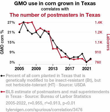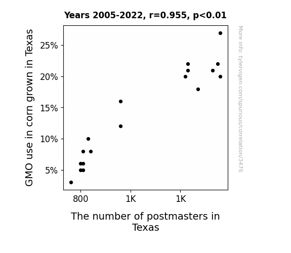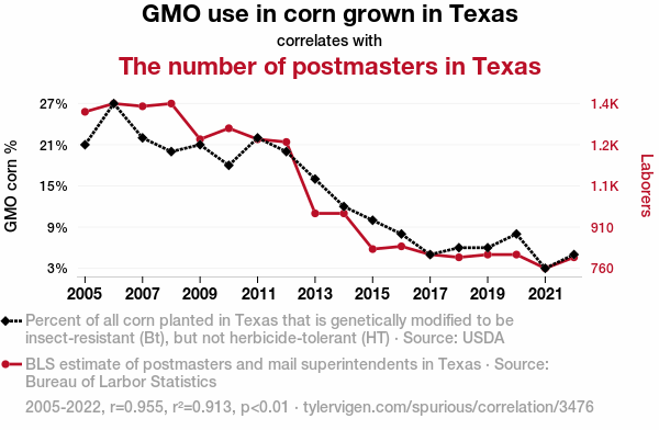 This means 91.3% of the change in the one variable (i.e., The number of postmasters in Texas) is predictable based on the change in the other (i.e., GMO use in corn grown in Texas) over the 18 years from 2005 through 2022.