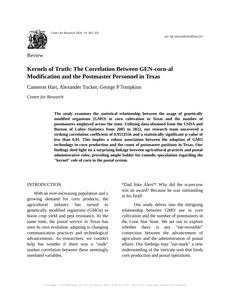 User prompt: Please provide potential search keywords for a paper titled Kernels of Truth: The Correlation Between GEN-corn-al Modification and the Postmaster Personnel in Texas with an abstract of The study examines the statistical relationship between the usage of genetically modified organisms (GMO) in corn cultivation in Texas and the number of postmasters employed across the state. Utilizing data obtained from the USDA and Bureau of Labor Statistics from 2005 to 2022, our research team uncovered a striking correlation coefficient of 0.9553556 and a statistically significant p-value of less than 0.01. This implies a robust association between the adoption of GMO technology in corn production and the count of postmaster positions in Texas. Our findings shed light on a surprising linkage between agricultural practices and postal administrative roles, providing ample fodder for comedic speculation regarding the "kernel" role of corn in the postal system.