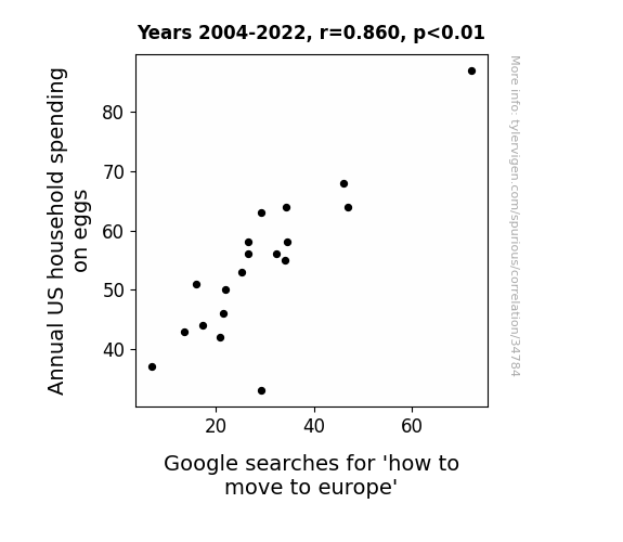 This means 73.9% of the change in the one variable (i.e., Google searches for 'how to move to europe') is predictable based on the change in the other (i.e., Annual US household spending on eggs) over the 19 years from 2004 through 2022.
