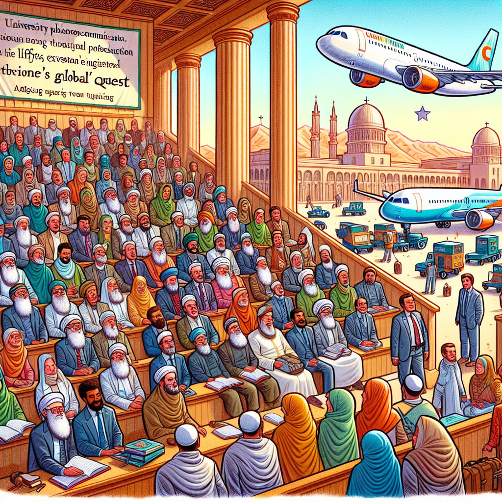 User prompt: Please describe a visual scene that prominently depicts both The number of university philosophy and religion teachers in Utah and Jet fuel used in Algeria, in the following situation: Jet fuel used in Algeria increased because the influx of university philosophy and religion teachers in Utah caused a surge in existential questioning, leading to a spike in people searching for meaning and deciding to travel to Algeria to find themselves. And, you know, traveling requires jet fuel.. Keep the description simple.