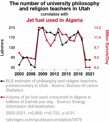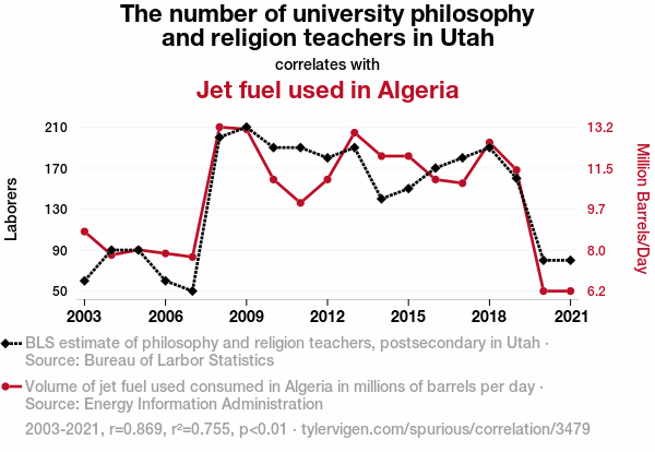 "university philosophy and religion teachers Utah", "jet fuel consumption Algeria", "correlation coefficient analysis", "Bureau of Labor Statistics data", "Energy Information Administration data", "interdisciplinary connections", "unexpected relationships in data analysis"