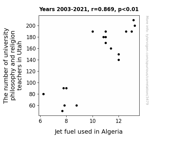 This means 75.5% of the change in the one variable (i.e., Jet fuel used in Algeria) is predictable based on the change in the other (i.e., The number of university philosophy and religion teachers in Utah) over the 19 years from 2003 through 2021.