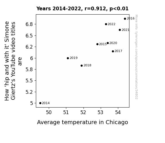 This means 83.2% of the change in the one variable (i.e., Average temperature in Chicago) is predictable based on the change in the other (i.e., How 'hip and with it' Simone Giertz's YouTube video titles are) over the 9 years from 2014 through 2022.