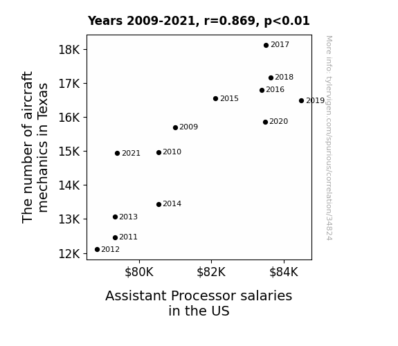 This means 75.5% of the change in the one variable (i.e., Assistant Processor salaries in the US) is predictable based on the change in the other (i.e., The number of aircraft mechanics in Texas) over the 13 years from 2009 through 2021.