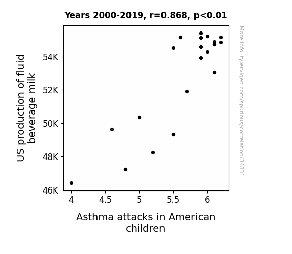 This means 75.4% of the change in the one variable (i.e., Asthma attacks in American children) is predictable based on the change in the other (i.e., US production of fluid beverage milk) over the 20 years from 2000 through 2019.