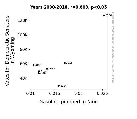 This means 65.2% of the change in the one variable (i.e., Gasoline pumped in Niue) is predictable based on the change in the other (i.e., Votes for Democratic Senators in Wyoming) over the 7 years from 2000 through 2018.