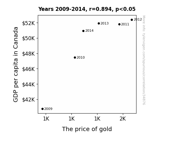 This means 79.9% of the change in the one variable (i.e., The price of gold) is predictable based on the change in the other (i.e., GDP per capita in Canada) over the 6 years from 2009 through 2014.