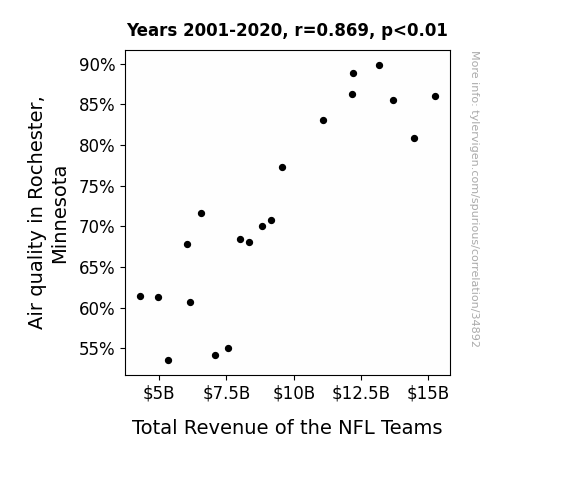 This means 75.5% of the change in the one variable (i.e., Total Revenue of the NFL Teams) is predictable based on the change in the other (i.e., Air quality in Rochester, Minnesota) over the 20 years from 2001 through 2020.