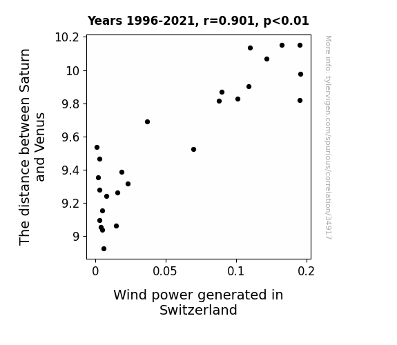 This means 81.2% of the change in the one variable (i.e., Wind power generated in Switzerland) is predictable based on the change in the other (i.e., The distance between Saturn and Venus) over the 26 years from 1996 through 2021.
