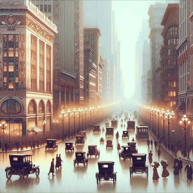 ChatGPT: Generate an image of a bustling street in Hagerstown, Maryland, adorned with intricate art nouveau details. The street is filled with people bearing the name Trinity, weaving through the city amidst heavy smog from increased car traffic. The hazy and congested atmosphere should be visually reflected in the image, with an emphasis on the ornate architectural style and a sense of bustling activity.