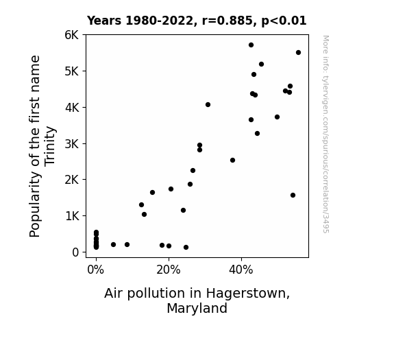 With a correlation coefficient of 0.8845810 and a p-value of less than 0.01, our findings reveal a robust relationship between the frequency of the name Trinity and air pollution levels in Hagerstown from 1980 to 2022. It appears that as the popularity of the name Trinity rose, so did the levels of air pollutants in this mid-Atlantic city. It's as if the air quality couldn't handle the heavenly presence of such a widespread name! If only we could mitigate pollution with the power of prayer and puns.