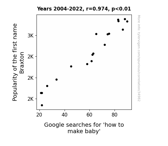 This means 94.9% of the change in the one variable (i.e., Google searches for 'how to make baby') is predictable based on the change in the other (i.e., Popularity of the first name Braxton) over the 19 years from 2004 through 2022.
