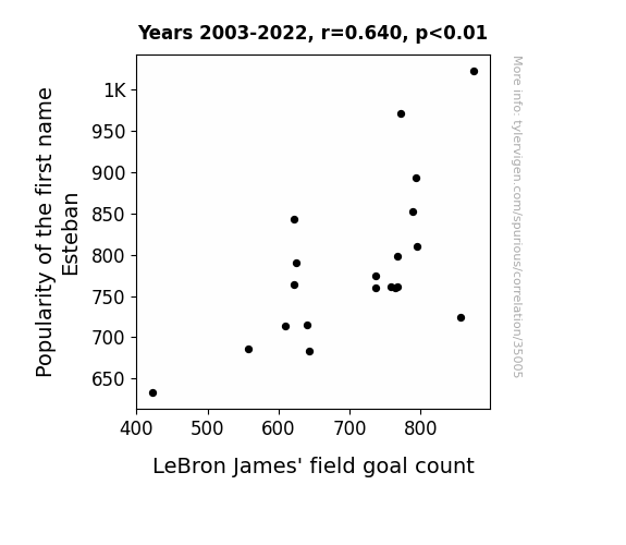 This means 41% of the change in the one variable (i.e., LeBron James' field goal count) is predictable based on the change in the other (i.e., Popularity of the first name Esteban) over the 20 years from 2003 through 2022.