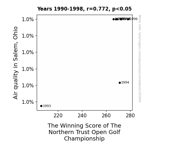 This means 59.7% of the change in the one variable (i.e., The Winning Score of The Northern Trust Open Golf Championship) is predictable based on the change in the other (i.e., Air quality in Salem, Ohio) over the 9 years from 1990 through 1998.