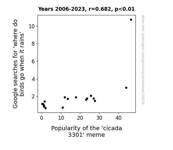 This means 46.5% of the change in the one variable (i.e., Popularity of the 'cicada 3301' meme) is predictable based on the change in the other (i.e., Google searches for 'where do birds go when it rains') over the 18 years from 2006 through 2023.