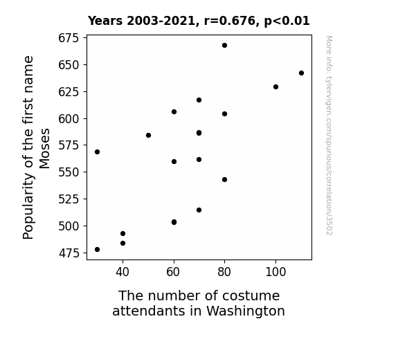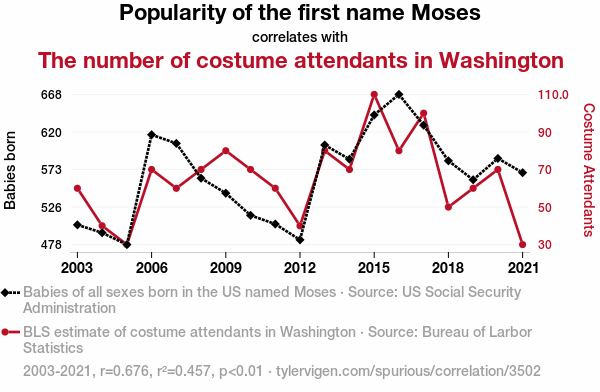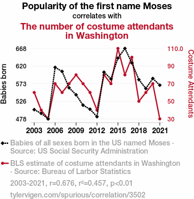 "Moses popularity", "costume attendants Washington DC", "US Social Security Administration data", "Bureau of Labor Statistics", "correlation coefficient Moses costume attendants", "Moses name popularity correlation"