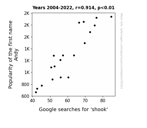 This means 83.5% of the change in the one variable (i.e., Google searches for 'shook') is predictable based on the change in the other (i.e., Popularity of the first name Andy) over the 19 years from 2004 through 2022.