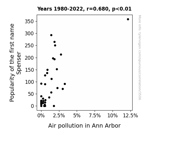 This means 46.2% of the change in the one variable (i.e., Air pollution in Ann Arbor) is predictable based on the change in the other (i.e., Popularity of the first name Spenser) over the 43 years from 1980 through 2022.