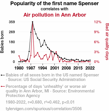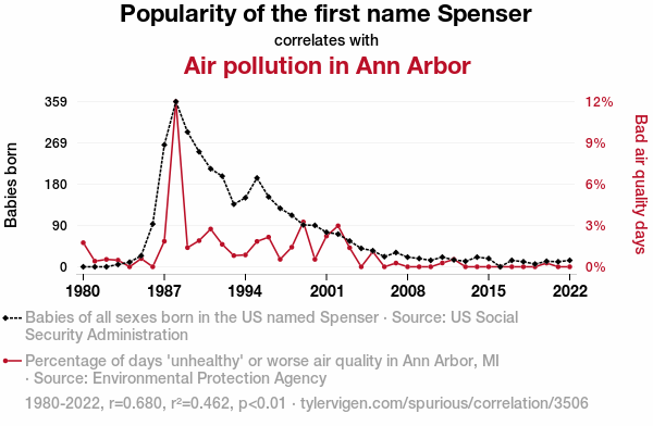 This means 46.2% of the change in the one variable (i.e., Air pollution in Ann Arbor) is predictable based on the change in the other (i.e., Popularity of the first name Spenser) over the 43 years from 1980 through 2022.