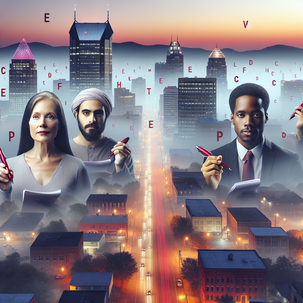 ChatGPT: Generate an image showing a dusky cityscape of downtown Chattanooga, Tennessee, with a thick layer of smog hovering in the air. Within the haze, depict a group of proofreaders gathered, each holding a red pen and engaged in correcting grammar and spelling errors that appear to be floating in the dense air. The skyline should be partially obscured by the fog to convey the difficult visibility caused by the smog.