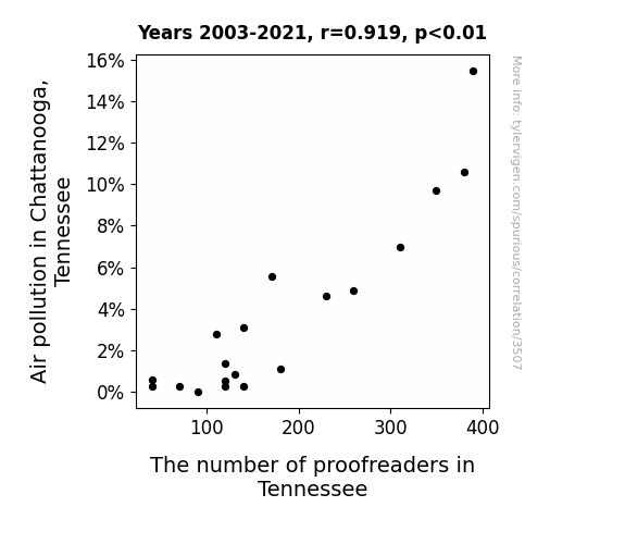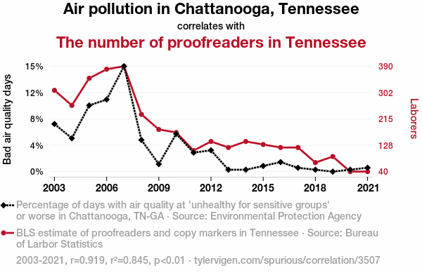 Air pollution, proofreaders, Tennessee, Chattanooga, correlation, statistical relationship, environmental protection agency data, bureau of labor statistics, smog, typo vigilantes, wordplay