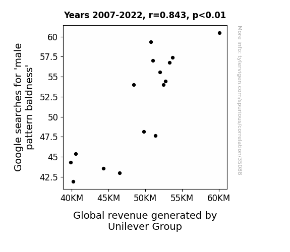 This means 71% of the change in the one variable (i.e., Global revenue generated by Unilever Group) is predictable based on the change in the other (i.e., Google searches for 'male pattern baldness') over the 16 years from 2007 through 2022.