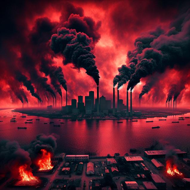 ChatGPT: Create an image of a camera positioned high above Lake Charles, Louisiana. The city is shrouded in a thick, ominous smog that casts a deep red hue across the sky, emphasizing the polluted air. Industrial chimneys release dark plumes of smoke, contributing to the hazy atmosphere. In the distance, a fierce fire rages, sending billows of black smoke upward. In the midst of this setting, a small group of people are engaged in a heated confrontation, their flushed faces mirroring the fire and anger that permeate the scene.