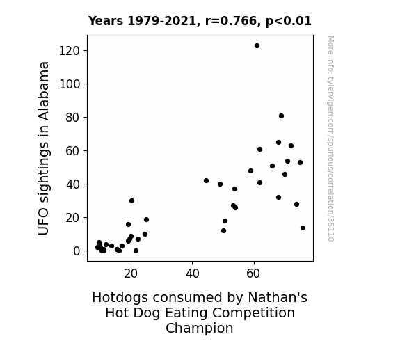 This means 58.7% of the change in the one variable (i.e., Hotdogs consumed by Nathan's Hot Dog Eating Competition Champion) is predictable based on the change in the other (i.e., UFO sightings in Alabama) over the 43 years from 1979 through 2021.