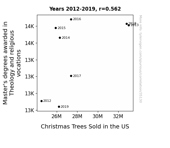 This means 31.6% of the change in the one variable (i.e., Christmas Trees Sold in the US) is predictable based on the change in the other (i.e., Master's degrees awarded in Theology and religious vocations) over the 8 years from 2012 through 2019.