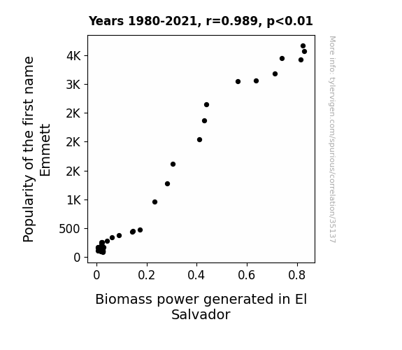 This means 97.9% of the change in the one variable (i.e., Biomass power generated in El Salvador) is predictable based on the change in the other (i.e., Popularity of the first name Emmett) over the 42 years from 1980 through 2021.
