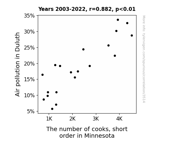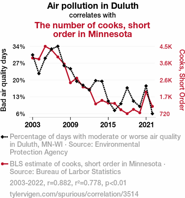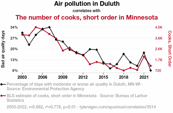This means 77.8% of the change in the one variable (i.e., The number of cooks, short order in Minnesota) is predictable based on the change in the other (i.e., Air pollution in Duluth) over the 20 years from 2003 through 2022.