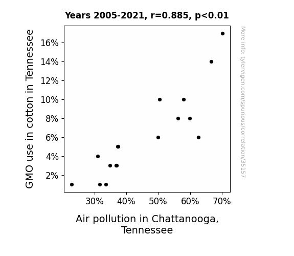 This means 78.4% of the change in the one variable (i.e., Air pollution in Chattanooga, Tennessee) is predictable based on the change in the other (i.e., GMO use in cotton in Tennessee) over the 17 years from 2005 through 2021.