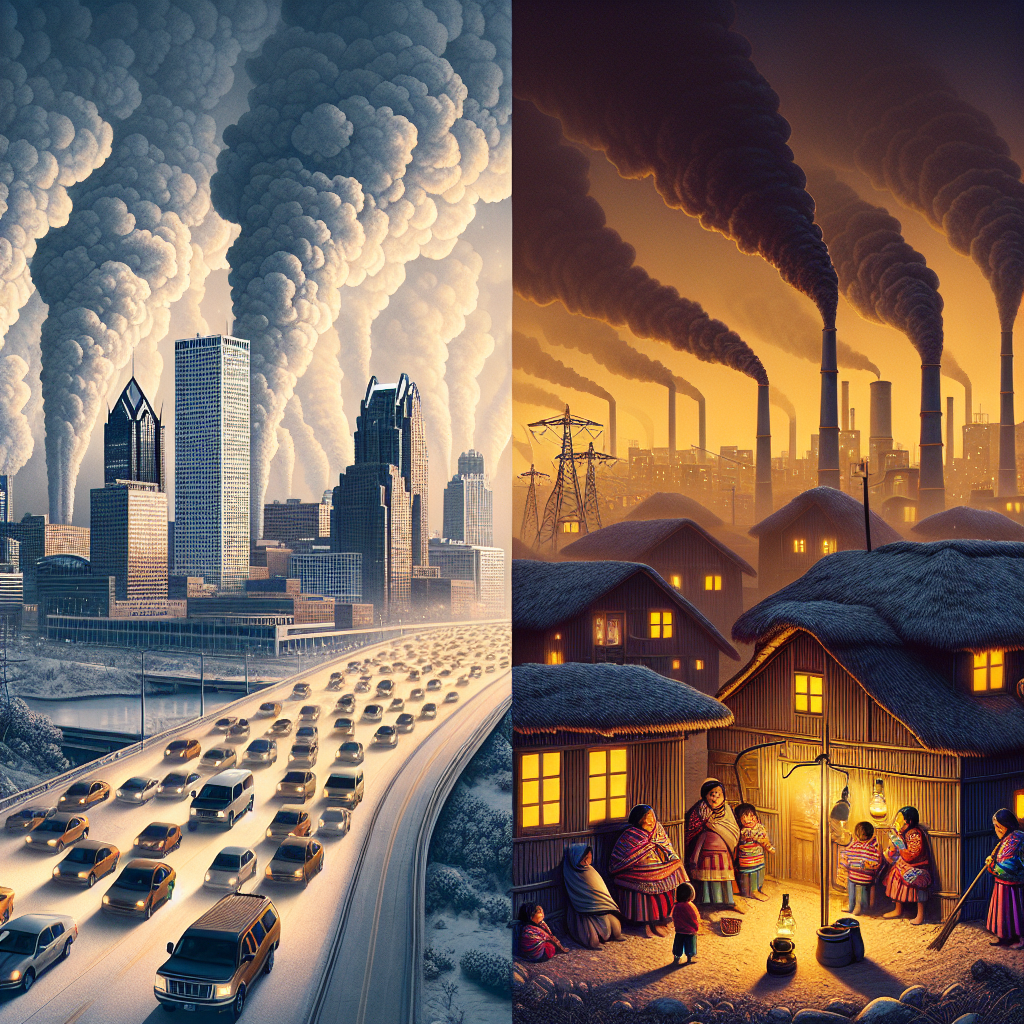 Prompt: Generate an image that combines the contrasting scenes of air pollution in Milwaukee and the use of kerosene in Peru. Depict the Milwaukee skyline veiled in thick smog with cars and factories emitting billows of pollution into the air. Show the dimly lit Peruvian village with families gathering around kerosene lamps, emphasizing the juxtaposition of a high-tech, industrialized city and a quaint, traditional setting. Create a stark contrast between the two settings, highlighting the impact of air pollution on vastly different communities. Ensure that the visual remains simple and does not include any words or speech bubbles. The depiction should include only scenes, people, and objects, it should not include text or speech bubbles.