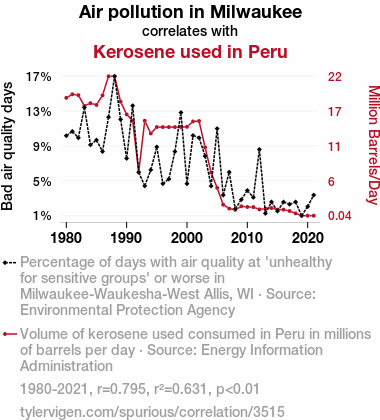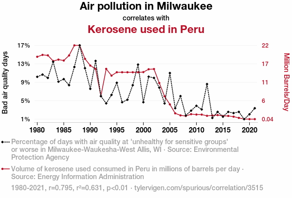 A linear line chart with years as the X-axis and two variables on the Y-axis. The first variable is Air pollution in Milwaukee and the second variable is Kerosene used in Peru.  The chart goes from 1980 to 2021, and the two variables track closely in value over that time. Small Image