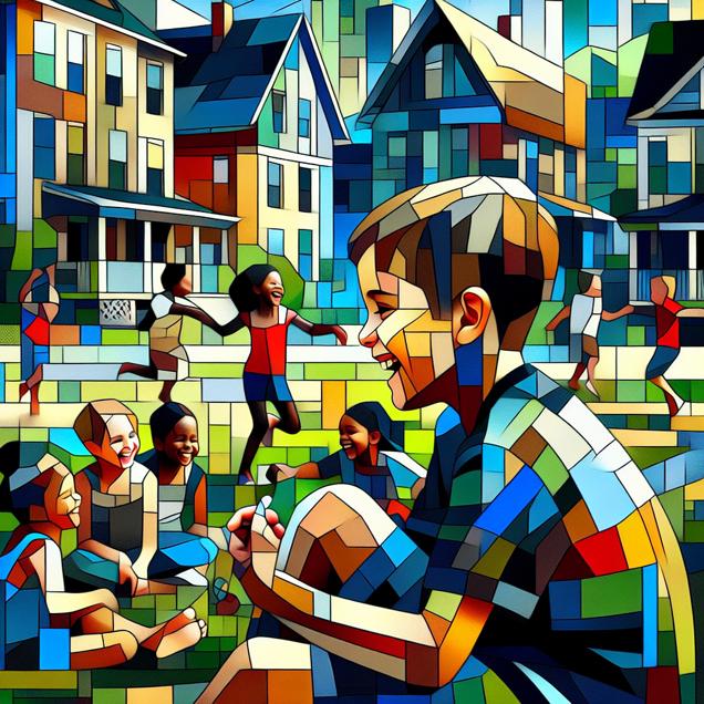 Prompt: Prompt: Generate a cubism-style representation of a serene neighborhood in Wheeling, West Virginia, teeming with life. Capture the essence of the scene with a collage of fragmented, geometric shapes and vibrant colors, focusing on the presence of a young boy named Josef playing and laughing with other children in the revitalized, pollution-free environment. The depiction should include only scenes, people, and objects, it should not include text or speech bubbles.
