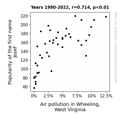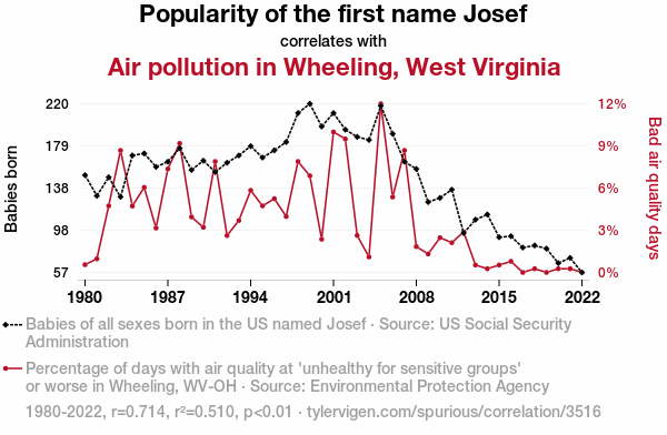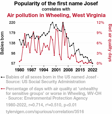 Josef, air quality, Wheeling, West Virginia, US Social Security Administration, Environmental Protection Agency, correlation coefficient, airborne pollutants, name frequency, statistical analysis, coincidence, cleaner air, statistical confusion, unlikely connections