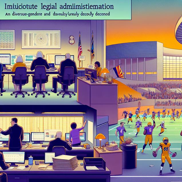 ChatGPT: Generate an image that depicts a futuristic courthouse in Arizona, where court and municipal clerks are diligently managing paperwork and records with advanced technology. In the background, a triumphant scene unfolds on a nearby football field, where the Arizona Cardinals celebrate a victorious game. The clerks' precision in record-keeping and managing penalties seamlessly contributes to the team's success, as their expertise directly impacts the Cardinals' winning strategies. The visual should capture the synergy between the clerks' meticulous work and the football team's triumph, showcasing a harmonious blend of futuristic legal administration and sporting achievement.