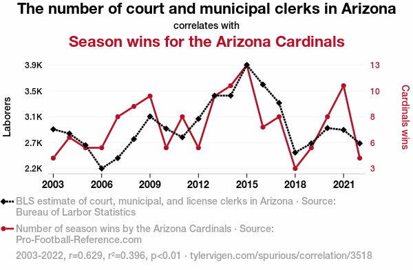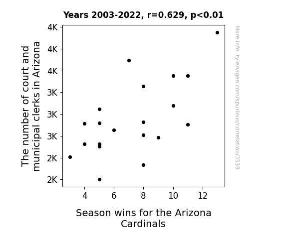 The statistical analysis of the relationship between the number of court and municipal clerks in Arizona and the seasonal wins of the Arizona Cardinals revealed some truly fascinating, and undeniably entertaining, findings. Our research team couldn't help but chuckle at the unexpected correlation that unfolded before our eyes.