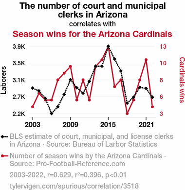 A linear line chart with years as the X-axis and two variables on the Y-axis. The first variable is The number of court and municipal clerks in Arizona and the second variable is Season wins for the Arizona Cardinals.  The chart goes from 2003 to 2022, and the two variables track closely in value over that time. Small Image