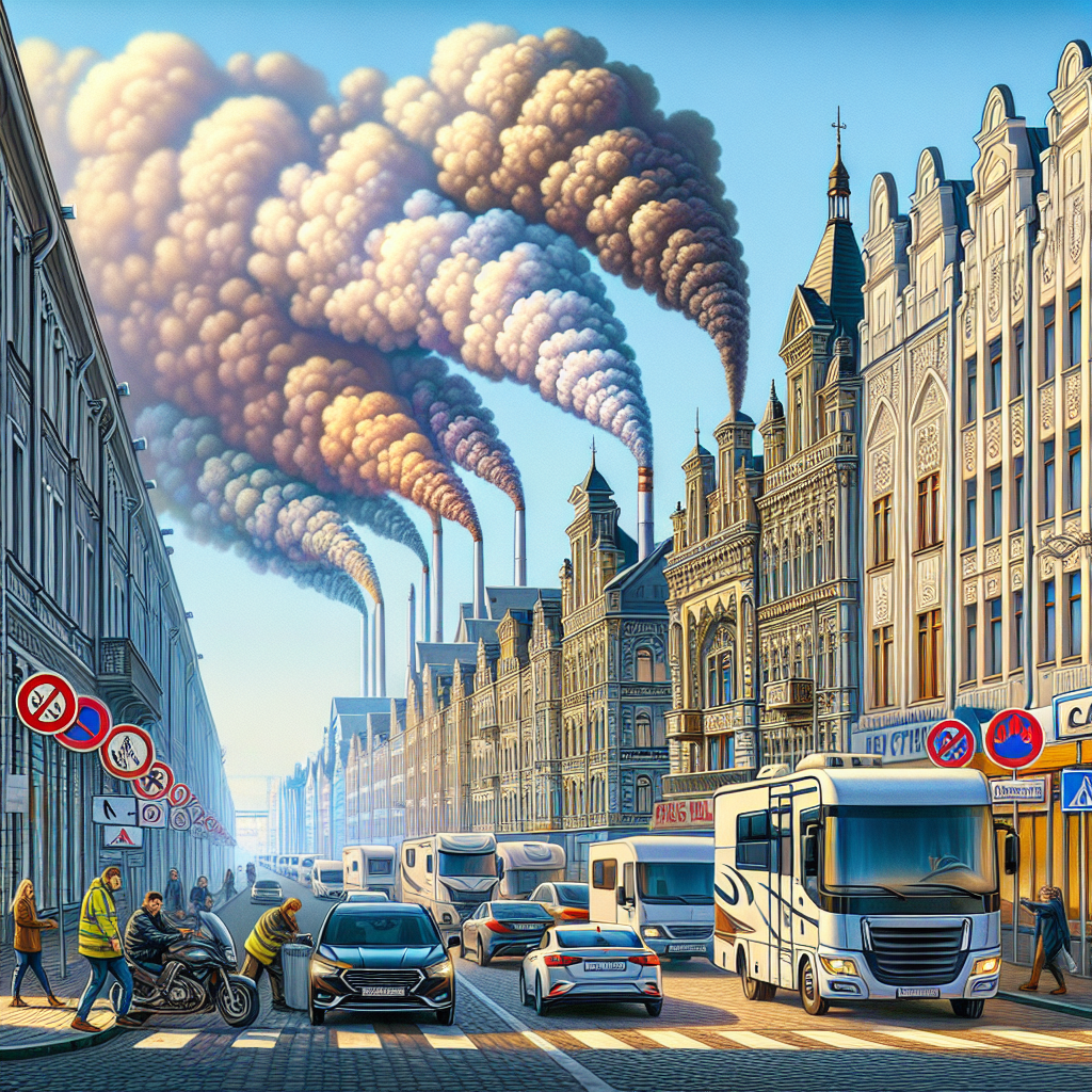 Prompt: Prompt: In a realistic style, generate an image of a city street in Belarus on a clear day. Show a line of cars and trucks driving through the bustling city. The smoke from their exhaust pipes mingles with the air, creating a noticeable haze. In the background, depict a Keystone RV dealership, where a group of employees is busy attaching recall notices to several recreational vehicles. The air pollution has resulted in malfunctions and safety concerns for their products. Capture the contrast between the serene city scene and the bustling activity at the dealership. The depiction should include only scenes, people, and objects, it should not include text or speech bubbles.