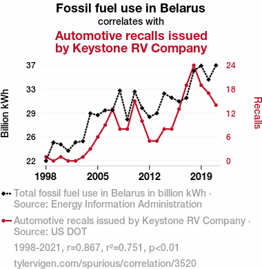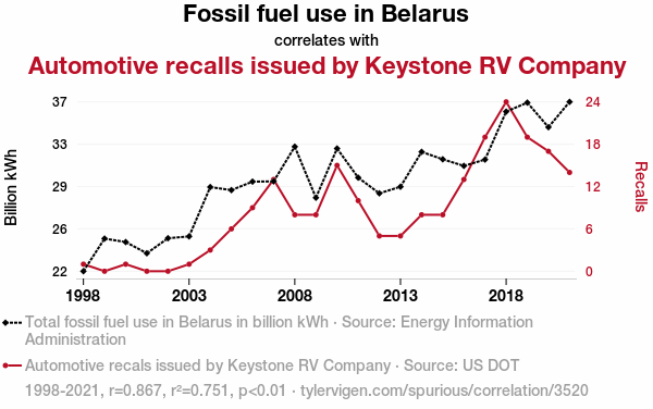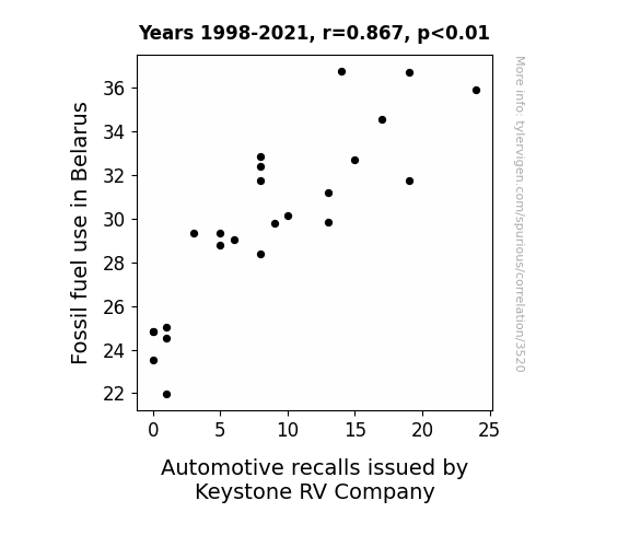 This means 75.1% of the change in the one variable (i.e., Automotive recalls issued by Keystone RV Company) is predictable based on the change in the other (i.e., Fossil fuel use in Belarus) over the 24 years from 1998 through 2021.