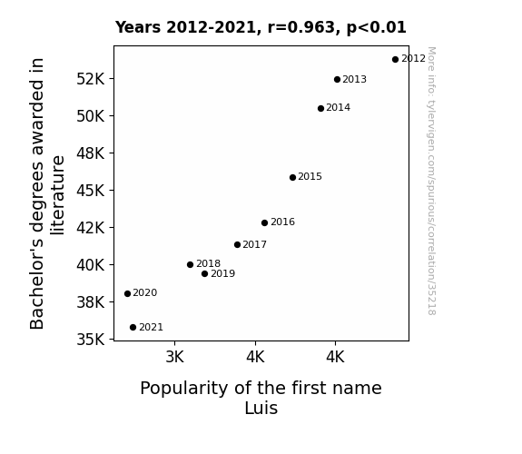 This means 92.7% of the change in the one variable (i.e., Popularity of the first name Luis) is predictable based on the change in the other (i.e., Bachelor's degrees awarded in literature) over the 10 years from 2012 through 2021.