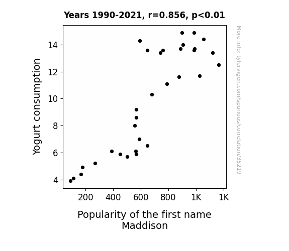This means 73.3% of the change in the one variable (i.e., Popularity of the first name Maddison) is predictable based on the change in the other (i.e., Yogurt consumption) over the 32 years from 1990 through 2021.