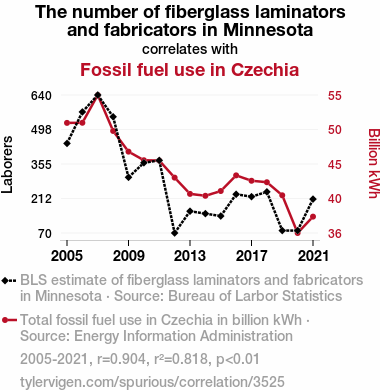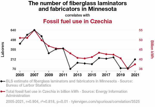 This means 81.8% of the change in the one variable (i.e., Fossil fuel use in Czechia) is predictable based on the change in the other (i.e., The number of fiberglass laminators and fabricators in Minnesota) over the 17 years from 2005 through 2021.